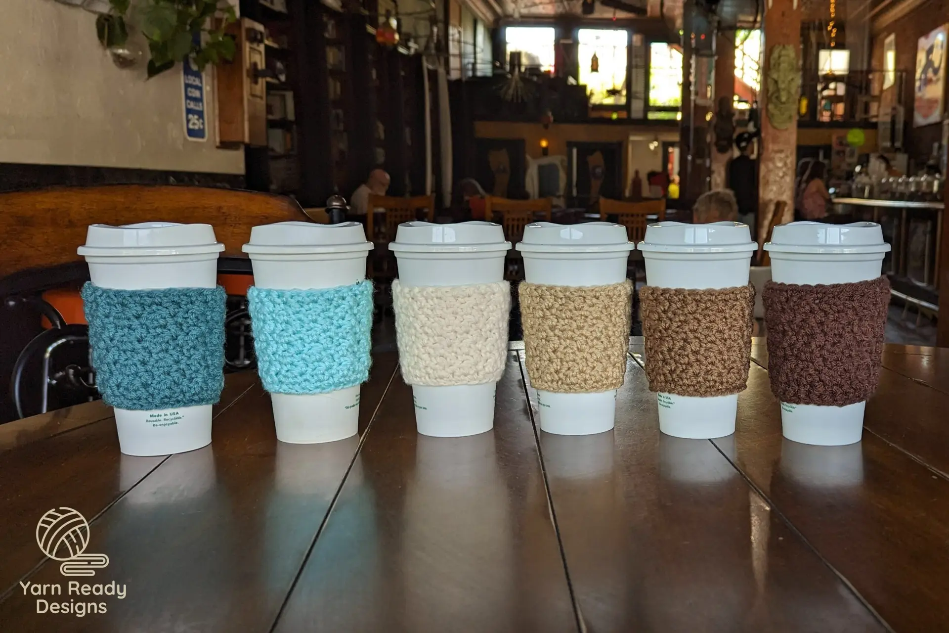 • The finished cozy should be stretchy enough to fit most standard coffee shop cups.
