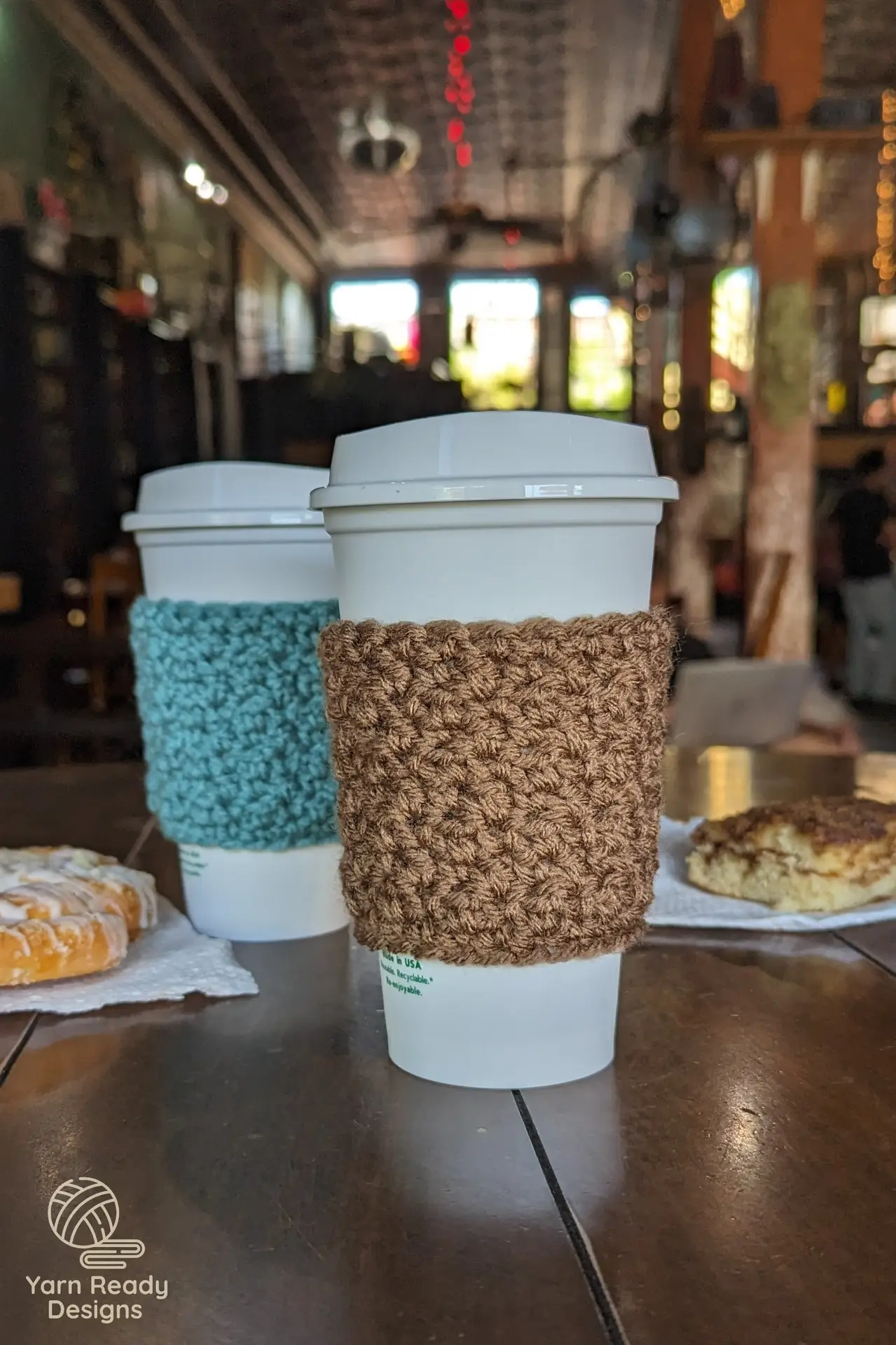 • Be mindful of the types of fibers used in case gifting one of these cozies to someone that may have sensitive skin or a specific allergy; I used acrylic yarn for the cozies seen in this pattern.
