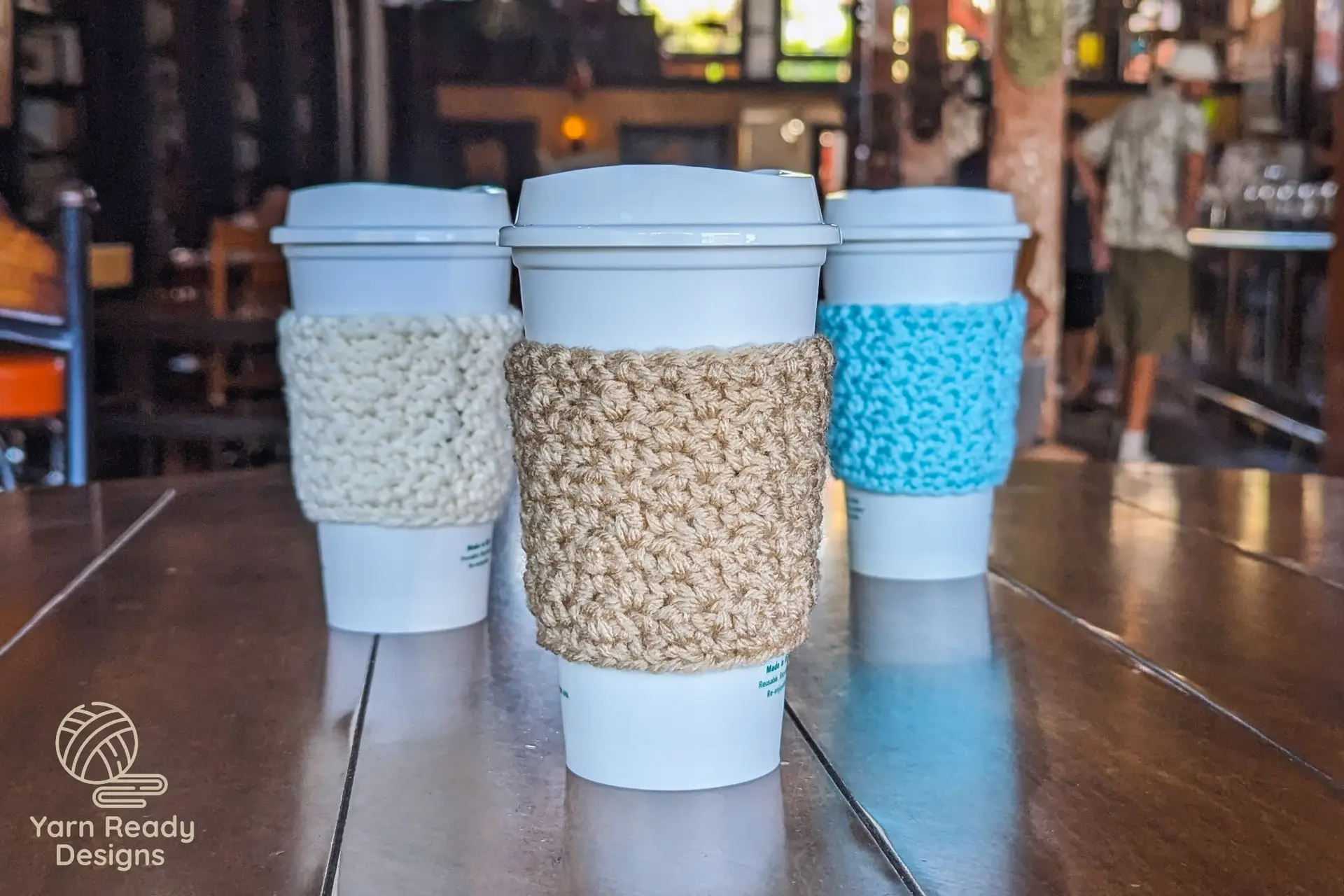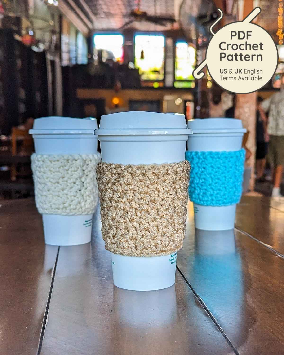 Slip a cozy sleeve onto your drink! Keep your hot drinks warm and collect the condensation of cold drinks! This is a pattern for a crochet sleeve to fit a standard sized coffee shop cup, made with medium/worsted weight yarn.
